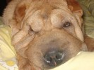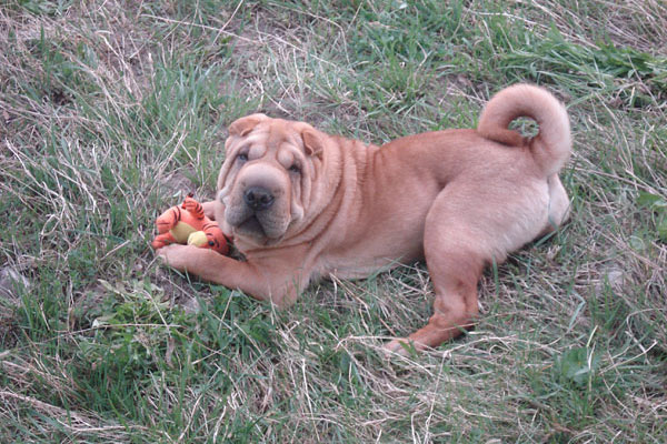 | Владелица шарпея Дуси о своей любимице: "Увидев фотографию Хагена, сравнили его с Дусей-они очень похожи. Дусенька любит кататься на машине, бегать за воронами и кошками, а так же мыться в ванной, а вот купаться в озере ее не заставишь.