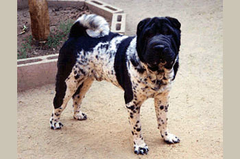 – с ним все ясно по определению, характеризуется рыжими, черными, голубыми, шоколадными пятнами на белом фоне, в США такой окрас называют flowered, то есть цветочный и он очень популярен, так как пятнистые шарпеи выглядят очень привлекательно. Группа энтузиастов цветочного окраса добивается признания АКС этого цвета как стандарного.