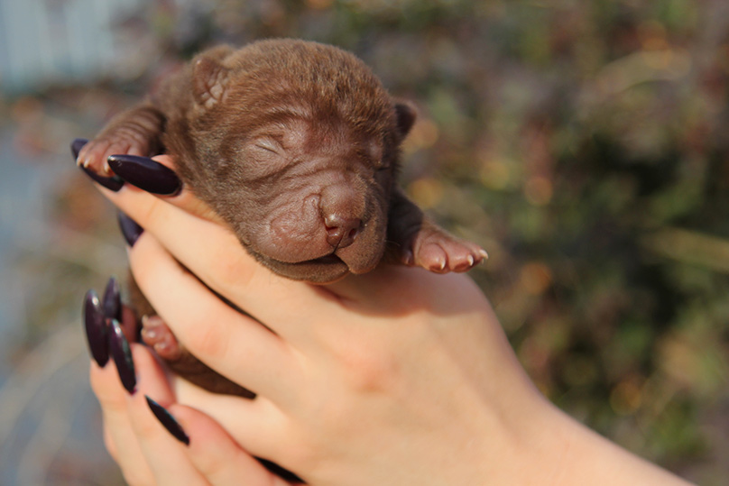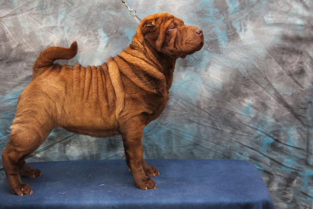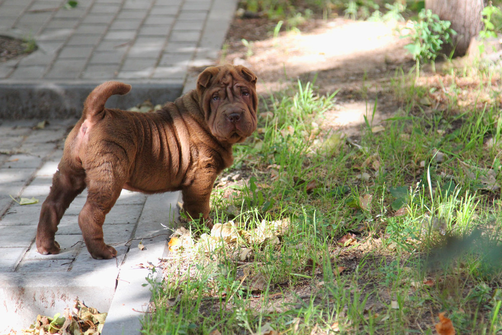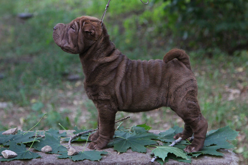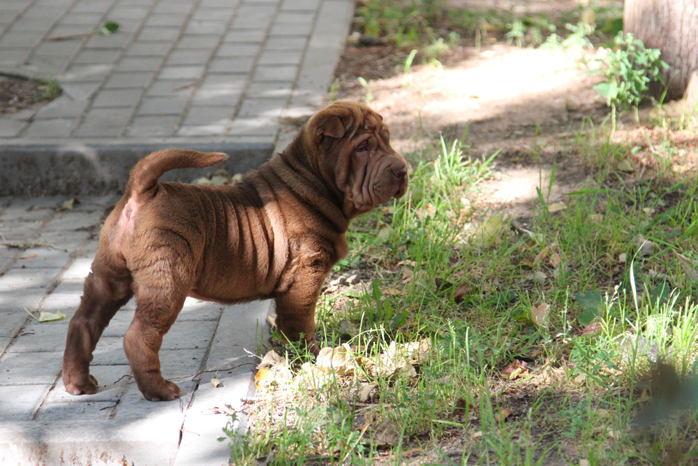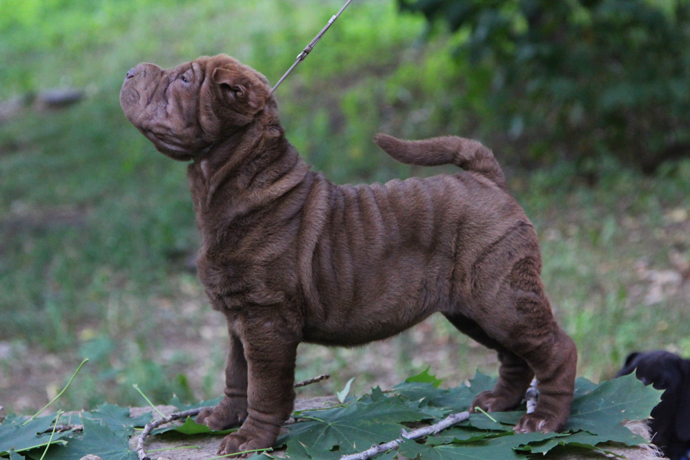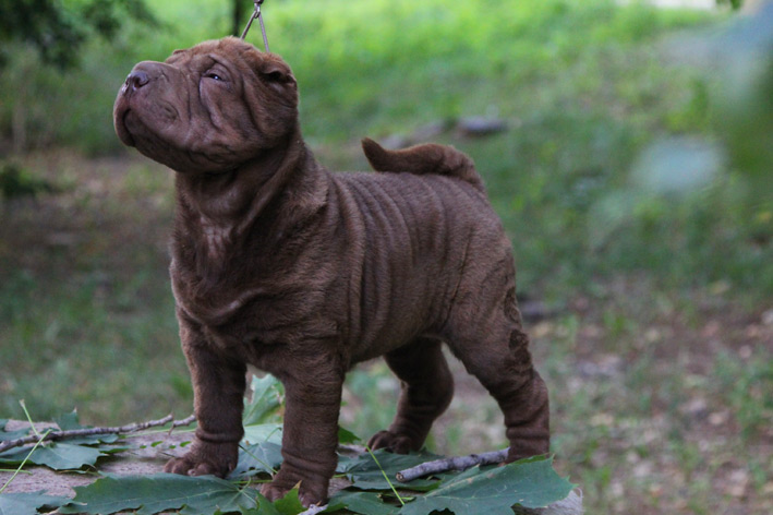 Можно вечно смотреть на огонь, воду и красивого щенка шарпея. У Чечетки превосходное сложение, это ладная фигуристая девочка в шубке цвета молочного шоколада. Ну и чтоб уж наверняка разбить вам сердце – она больше не будет расти, ведь это сокровище – миниатюрный шарпей. Бездна обаяния и прекрасный характер. Будучи веселой и любознательной, она всегда в первых рядах посмотреть, кто пришел (и что принес), но никогда не станет мешать, ведь это еще и очень воспитанный минипей.