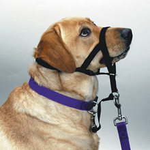 В крупных зоомагазинах и многих интернет-магазинах (многие посылают свои товары по всей России) есть в продаже такой девайс. Принцип работы похож на недуздок у лошади. Поводок крепится к кольцу снизу под мордой, таким образом, Вы держите собаку не за шею, а за голову. При натягивании поводка собаке придется сворачивать голову набок, что некомфортно для нее. Рекомендую фирмы Gentle Leader или Halti. ![]()