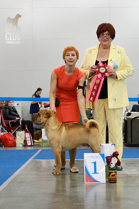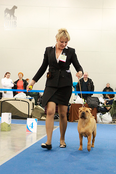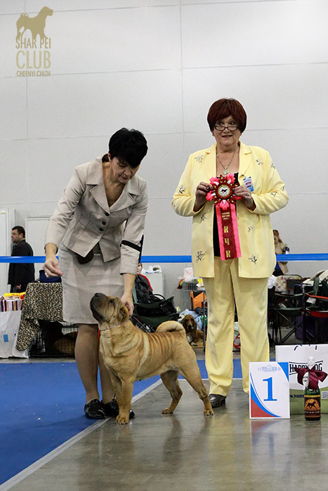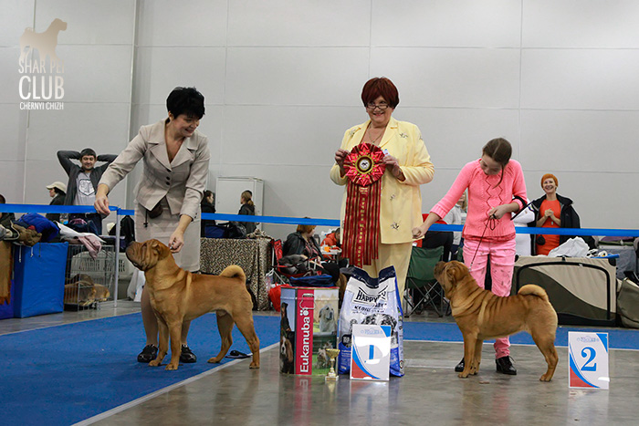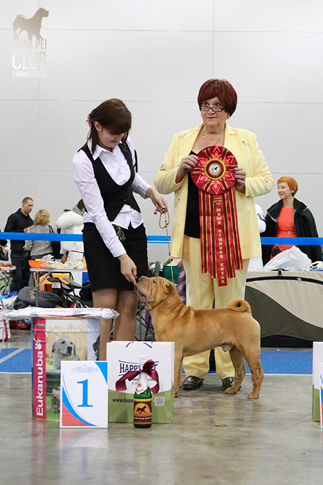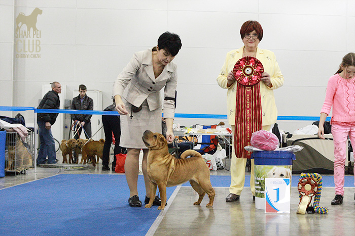 Национальная монопородная выставка "Золотой Шарпей 2013" Судил судья-породник с тридцатилетним стажем из Германии (Linda Gebauher). Очень импозантная дама, с оригинальным чувством юмора, от души расстраивалась любым проблемам с темпераментом, при этом обращалась с собаками довольно грубовато, что для породника выглядело мягко говоря странновато. Шутила с расстановками, порой вводя в заблуждение участников шоу, но в целом оставила приятное впечатление. Одним словом, оригиналка. Хочется отметить наш НКП порадовавший на этот раз хорошим призовым фондом, все остались очень приятно удивлены: прекрасные розетки и другие дополнительные призы каждому участнику. Наши результаты: Большое спасибо Маше Кирилловой за фоторепортаж с выставки! В ближайшее время всех ждет видеорепортаж с этой выставки.