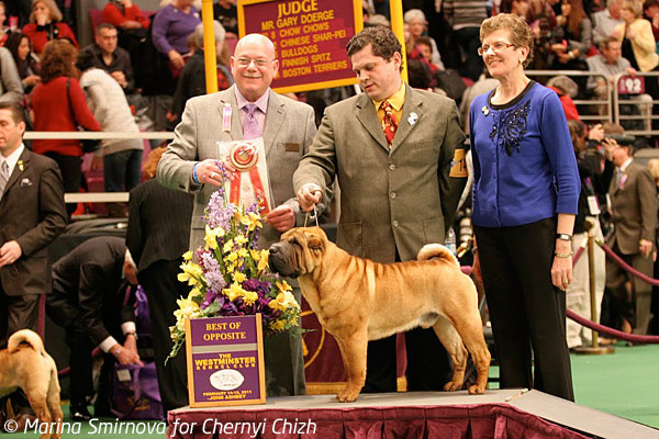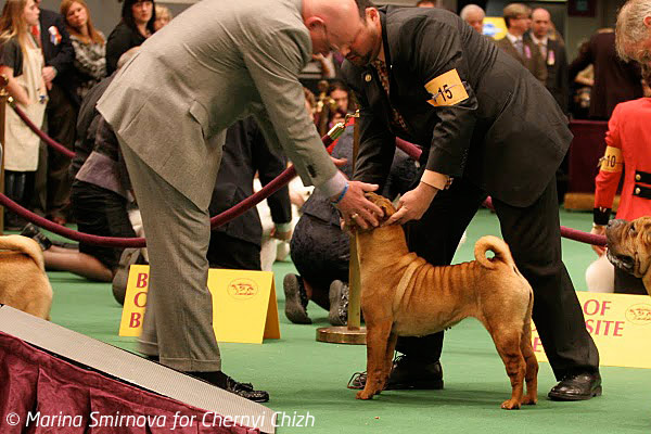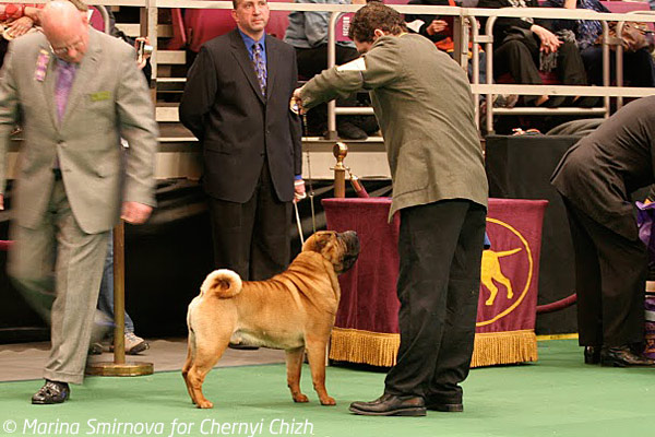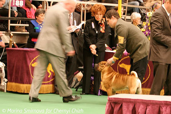Теперь у нас есть VAJE’S MISS JANE HATHAWAY четы Mauk. Мы наблюдали за ней последние пару лет, когда она завоевала верхние позиции рейтинга породы, став победительницей конкурса National’s Invitational Winner и конкурса National’s Best of Breed. Есть у нее также масса наград «ЛПП». Она хорошо показала себя в групповых чемпионатах и даже один или несколько раз становилась лучшей на выставке в рамках проводимых АКС мероприятий. И совершенно недавно она завоевала ранг Best of Breed и еще один групповой разряд в престижном Национальном чемпионате АКС (Eukanuba) в Лонг-бич, Калифорния. Сегодня второй день выставочного чемпионата. В первый день на ежегодном чемпионате в рамках выставки собак Вестминстерского кинологического клуба в Мэдисон-сквер гарден, Нью-Йорк, было представлено одиннадцать шарпеев, но только 7 из них прошло квалификацию судей. Изначально было сложно понять, какую собаку выберет судья GARY DOERGE , но в конце Джейн удалось одержать победу. Не нужно говорить, что были сложности, но уже не такие, с которыми мы сталкивались во время группового разряда. Трудными конкурентами были бишон фризе, представленный Скоттом Соммерсом, и красивый (если кто-то считает пуделей красивыми) белый стандартный пудель, представленный Тимоти Бразиром. На финишную прямую вышли кесхунд, бишон, бульдог, лхаса апсо, Lowchen, стандартные и миниатюрные пудели, a Шипперке и MISS JANE вышли в победители. Судил Эверетт Дин, который, как мы знаем, не равнодушен к нашей породе. И когда он определил MISS JANE в качестве победителя первой группы, мы были восхищены! Я уверен, что многие из вас видели безупречное выступление Джейн в ринге и показательное выступление хендлера Клинта Ливингстона, которое последовало следом. Ее движения были совершенными, четко в соответствии со стандартами породы, с незаметными усилиями и характерным задором она просто плыла по рингу, завораживая зрителей. Пятый ринг оказался слишком маленьким, чтобы по-настоящему оценить движения собаки, но, насколько вы знаете, судейская группа заняла весь этаж Garden и дала достаточно места Клинту, чтобы он показал все, на что способна Мисс Джейн. Сегодня вечером мы увидим ее выступление в противовес бородатой колли (группа «пастушьи» – действительно красивая собака с отточенными движениями), еще одному пекинесу (группа «декоративные» – напоминает пушистую ползающую сосиску на лапках), шотландской оленьей борзой (группа «борзые» - достаточно неуклюжая) и кандидатам в победители из спортивной, ездовой и терьерской групп. Мы знаем, что сегодня вечером решающим будет слово судьи Паолы Дондина из Италии, и мне искренне хочется, чтобы это все же был «год китайского шарпея» благодаря тому, что MISS JANE, разведения Вики и Джеффа Маук, заберет трофей «Лучшей на выставке»! Помимо прочего (здесь я не присутствовала, но мне пересказал Джефф, который слушал это по телевизору), судья Эверетт Дин в ответ на вопрос – трудно ли ему было принять решение относительно победителя первой группы, заметил: «…это было просто, поскольку соревнования не было». Давайте надеяться, что сегодня вечером Паола Дондина будет придерживаться того же мнения."